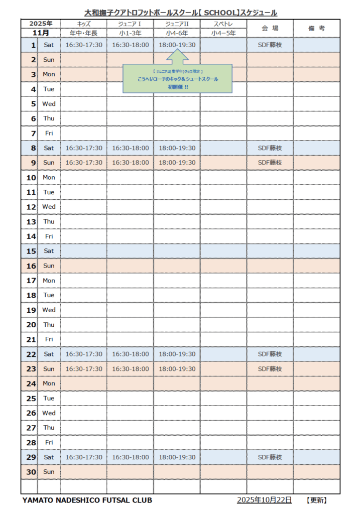 土曜日他(日・祝開催あり)エスパルスドリームフィールド藤枝(SDF藤枝)を拠点に活動しています。