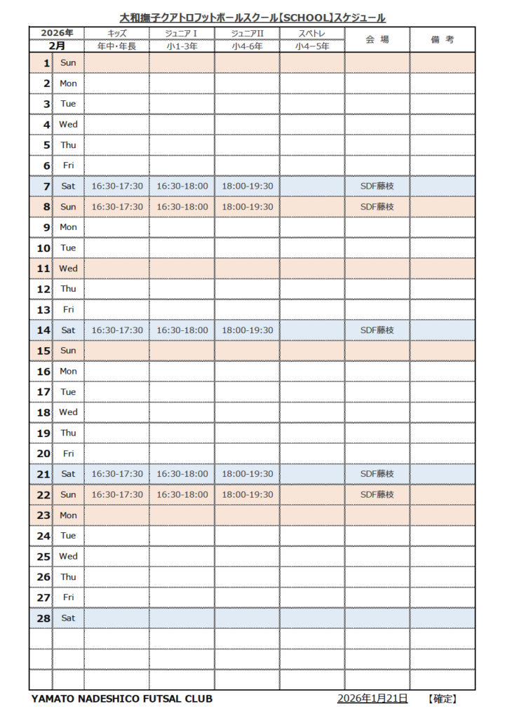 土曜日他(日・祝開催あり)エスパルスドリームフィールド藤枝(SDF藤枝)を拠点に活動しています。